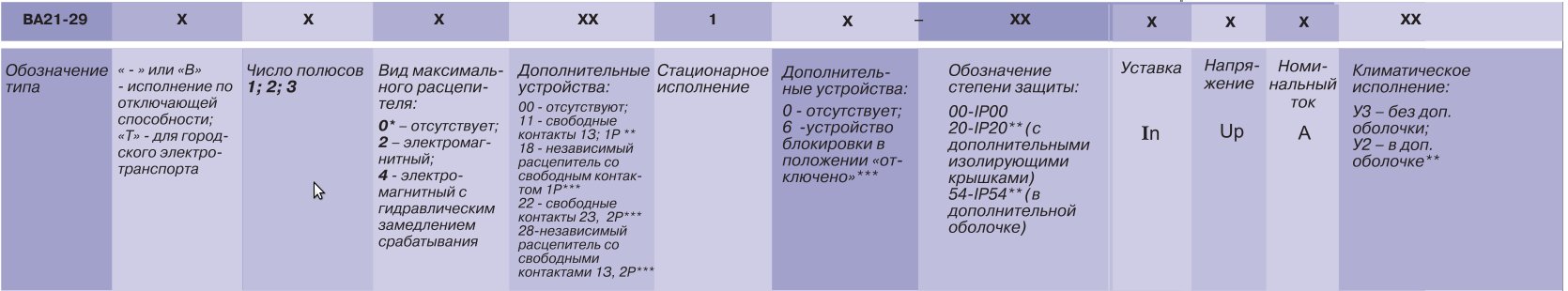Выключатели ВА 21-29 используются для проведения тока в нормальном режиме и отключения тока при перегрузках и коротких замыканиях или только при коротких замыканиях, а также для оперативных включений и отключений электрических схем. Основное назначение выключателей – защита кабелей и проводов, а также электродвигателей.